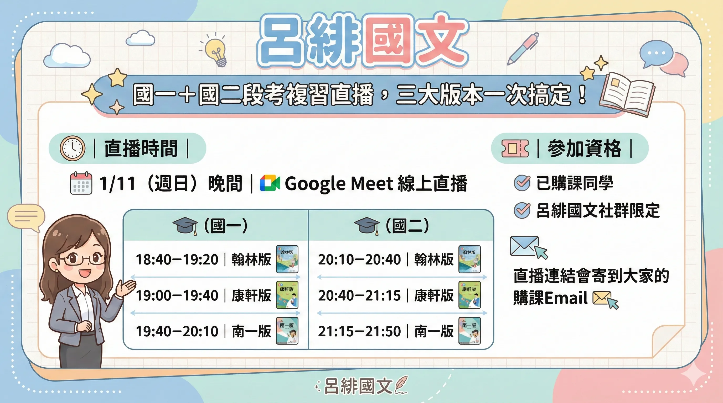 這次直播我把 翰林、康軒、南一 三大版本的精華考點都整理好了!不管學校用哪個版本,都能在這次直播中找到你的「定心丸」。